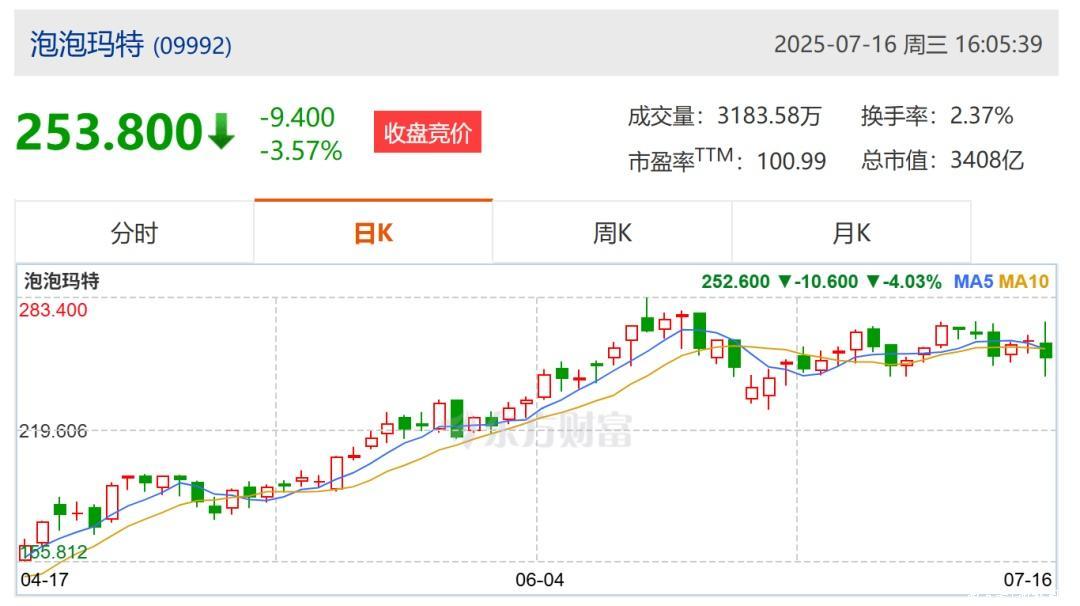 在交出一份亮眼的业绩大增预期答卷后,泡泡玛特股价却大跌。截至今日收盘,泡泡玛特(09992.HK)报253.8港元,较开盘价261.00港元下跌3.57%,盘中最低触及245.20港元,总市值3408亿港元。
