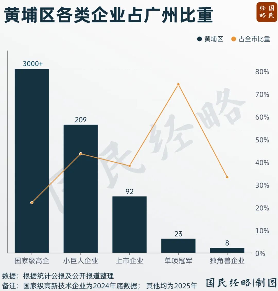 目前,黄埔区、广州开发区集聚2万多家科技型企业、超3000家国家高新技术企业,累计培育国家级单项冠军23家、国家级专精特新“小巨人”209家,上市企业数量超过90家,独角兽企业8家。