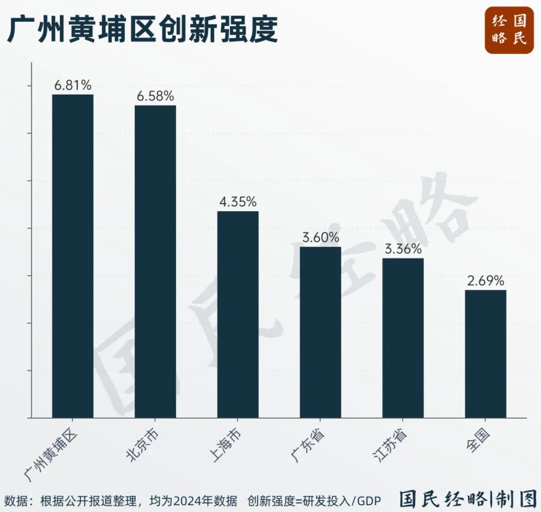 论创新实力,黄埔区、广州开发区2024年研发强度(研发投入/GDP)高达6.81%,达到世界一流水平,分别相当于全省、全国的1.9倍、2.5倍,一个区的研发投入超过西部、东北的11个省份。
