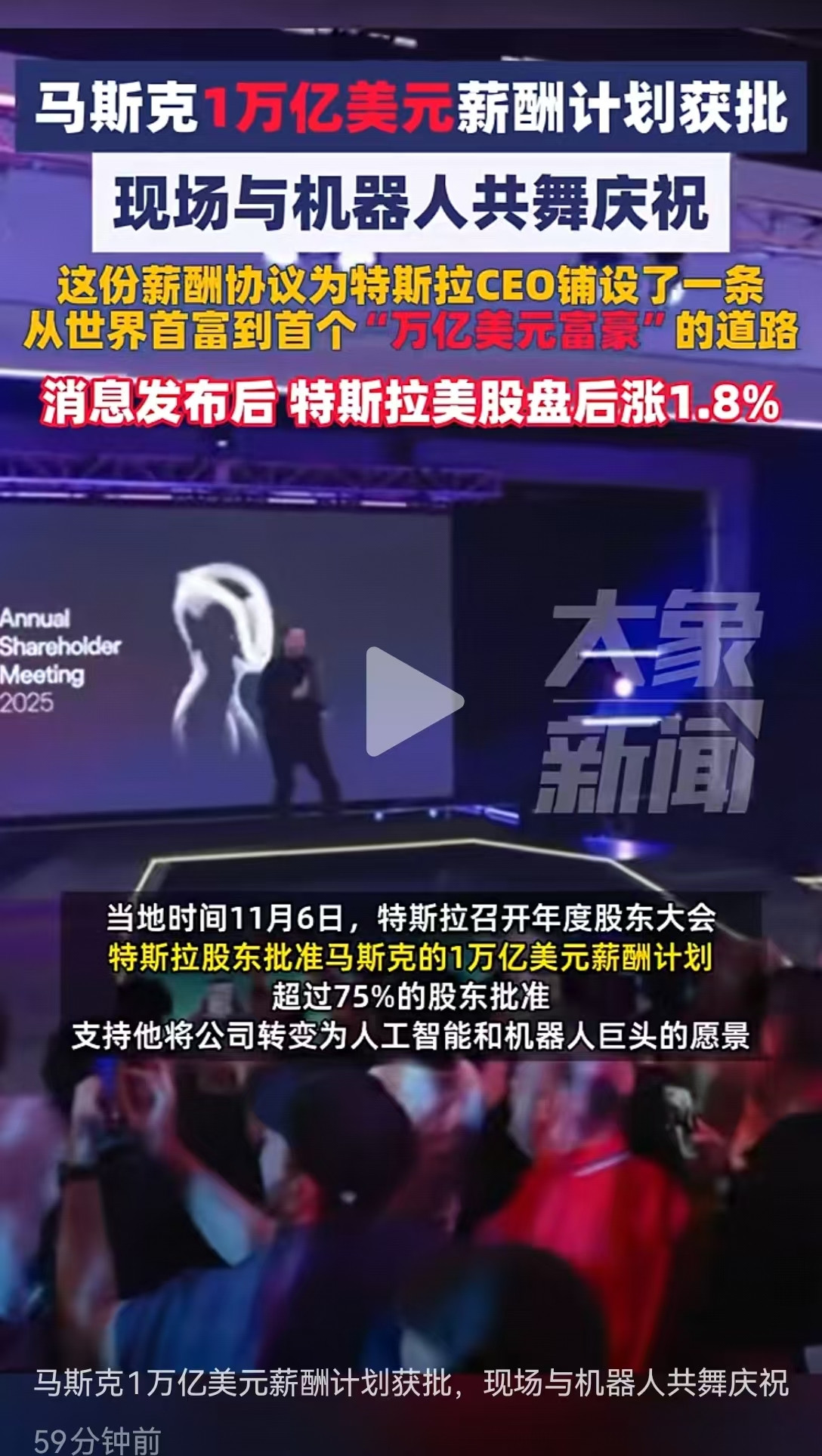 北京时间11月7日凌晨,特斯拉召开年度股东大会,特斯拉股东批准马斯克的1万亿美元薪酬计划,超过75%的股东批准,支持他将公司转变为人工智能和机器人巨头的愿景。