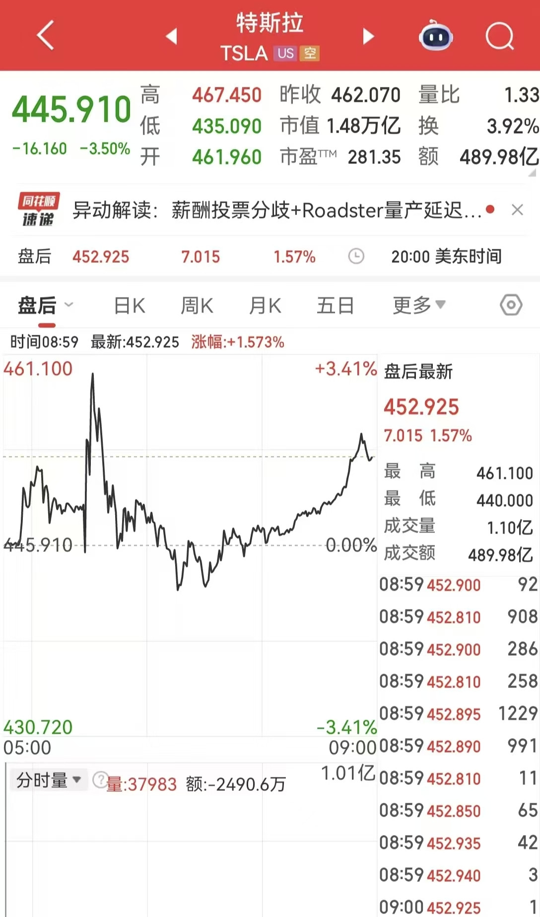 截至当地时间11月6日收盘,特斯拉报445.91美元,跌幅3.50%。值得注意的是美股盘后,特斯拉一度涨超3%。